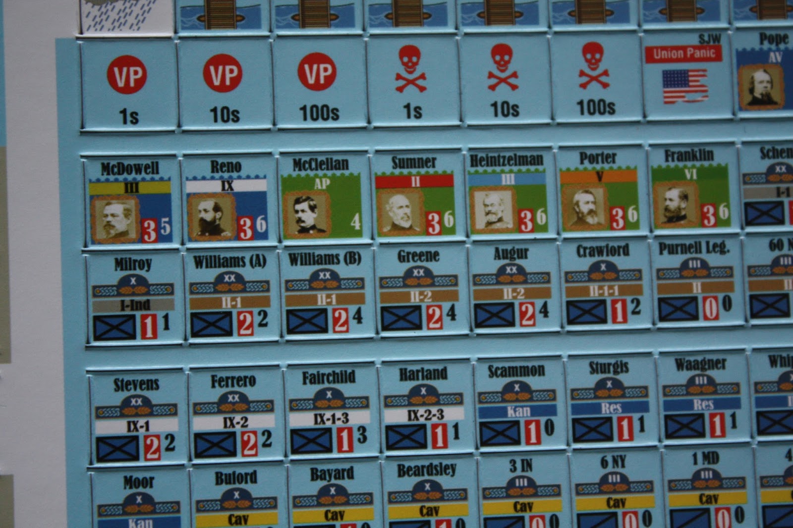 Gros plan sur les pions de généraux confédérés. |